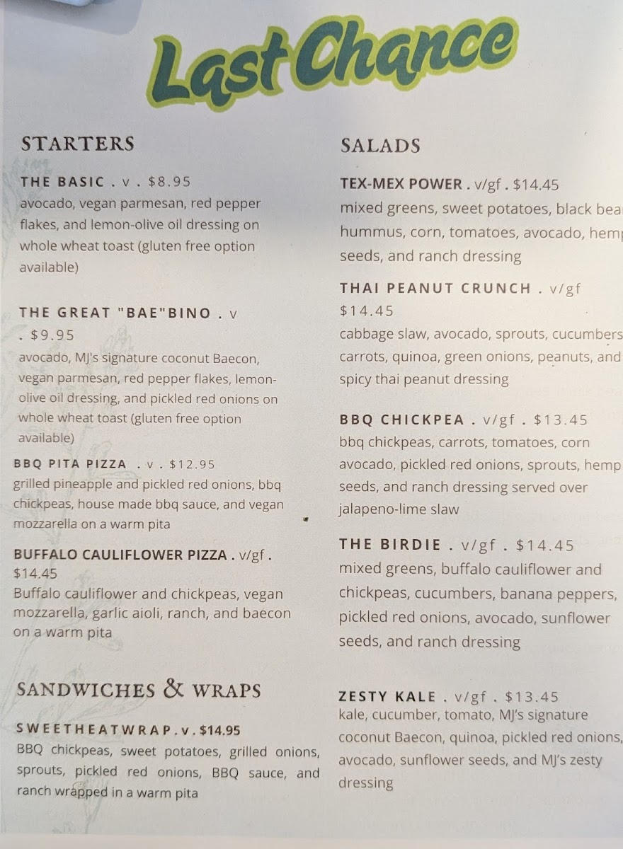 romaine lettuce, cucumber, corn, crispy chickpeas, tomatoes, avocado, croutons, MJ's signature coconut BAEcon, pumpkin seeds, and vegan ranch dressing.